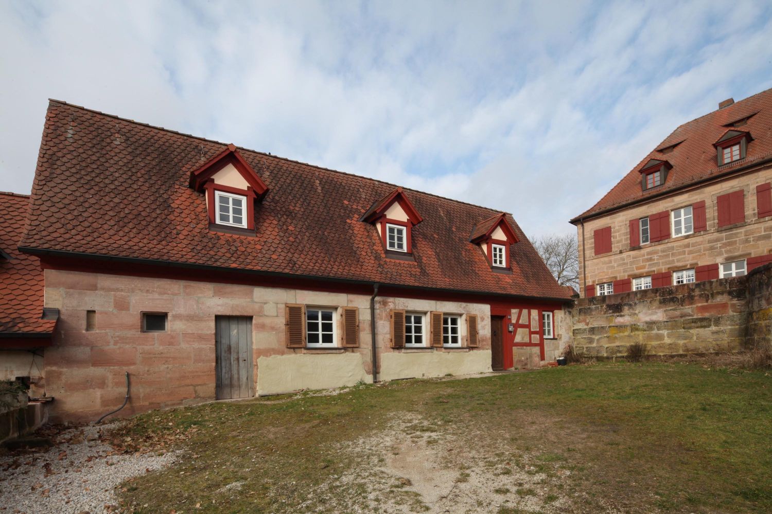 Ehem. Wohnstallhaus, eingeschossiger Sandsteinbau mit Steilsatteldach, 1859, zwei Zwerchhausaufbauten, wohl 1. Viertel 20. Jh.